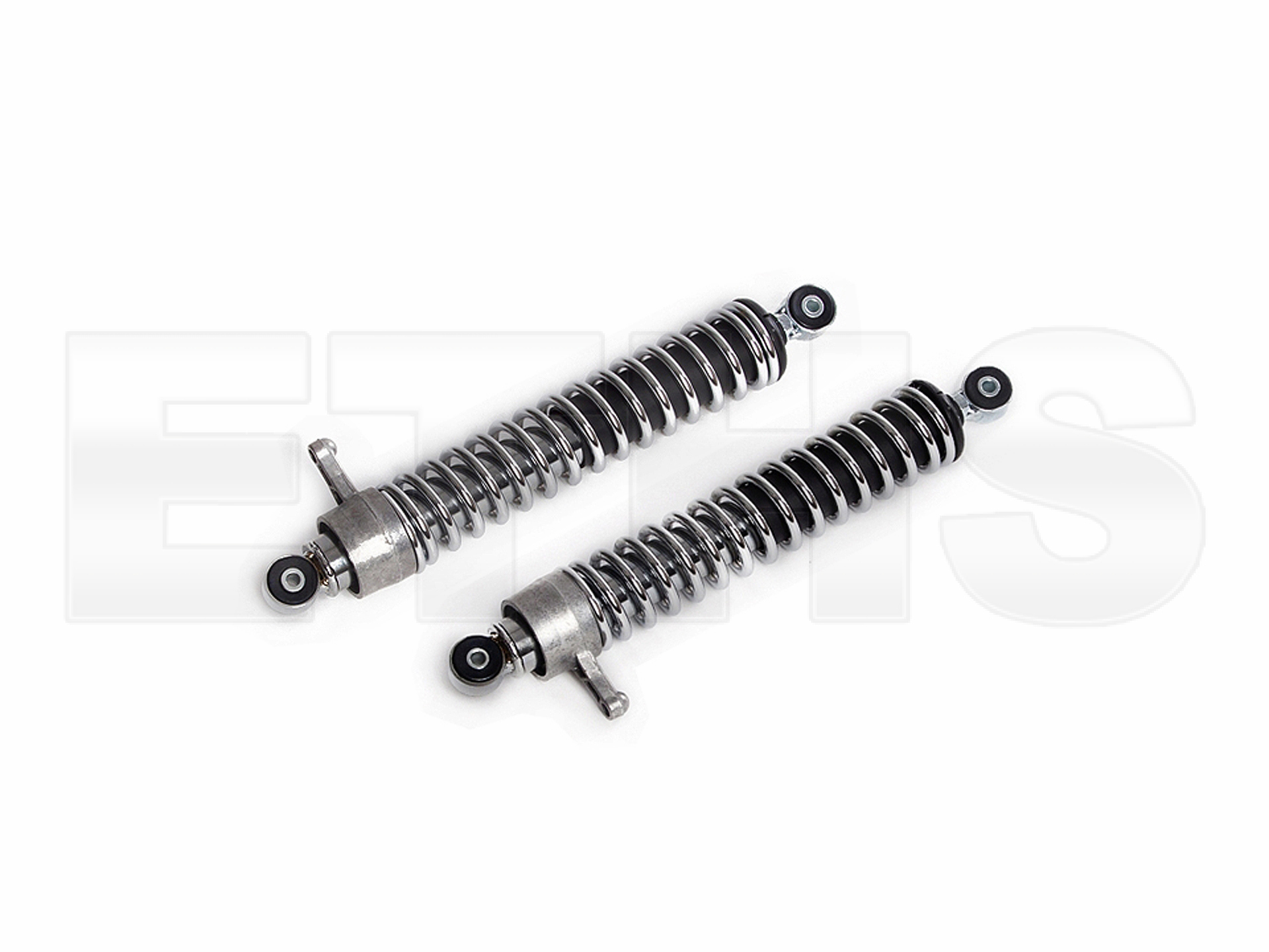 Der Federbein ( Stoßdämpfer ) Satz hat Chromfedern und ist 2-fach verstellbar, der Lochabstand beträgt 36cm.