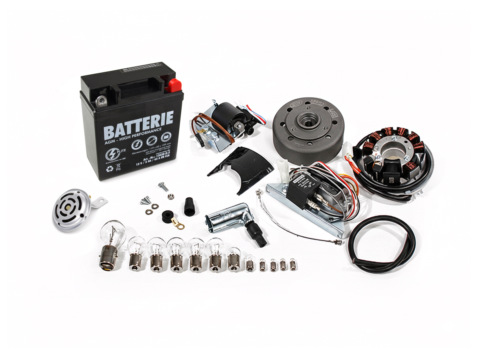 Es handelt sich ihr um die Zündung VAPE A70S3 dies ist eine 12V Anlage. Die VAPE Zündung stellt bei hoher Drehzahl den Zündzeitpunkt automatisch vor. Mit enthalten sind Schwungscheibe (Magnete sind kpl. vergossen), Grundplatte, Regler, Zündspule, Blinkgeber, Kabel, Halterung, Hupe verchromt, Batterie und Birnen. Die Zündung ist für Bilux Leuchtmittel geeignet. Eine Einbauanleitung mit Bildern und ein Schaltplan zum anschließen liegt bei. Das ist ein Original Ersatzteil, (die Batterie, Hupe, Birnen aber nicht).